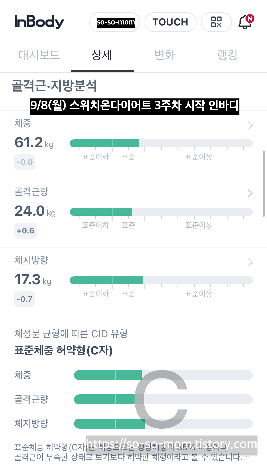 스위치온 2주차 종료 후 3주차 시작하는 아침 인바디 측정결과 제 기준으로, 드라마틱한 변화가 아니라 좀 실망했는데